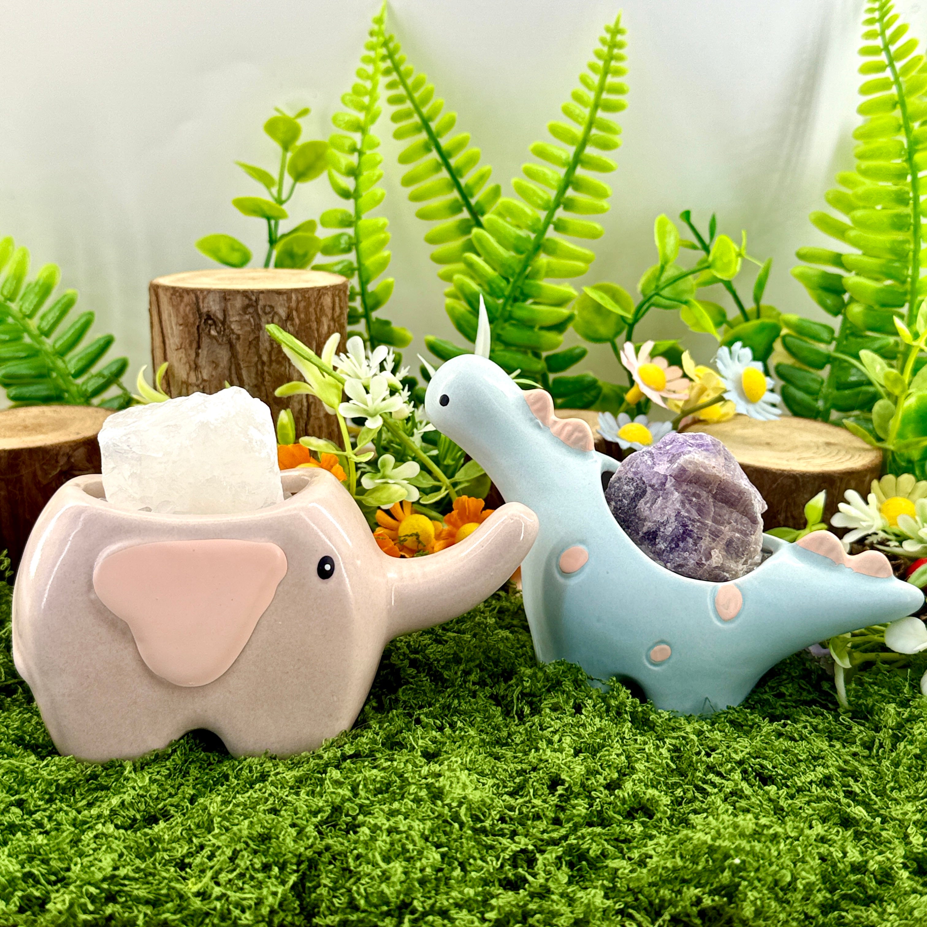 Clear Quartz Elephant & Amethyst Dinosaur Healing Figurines