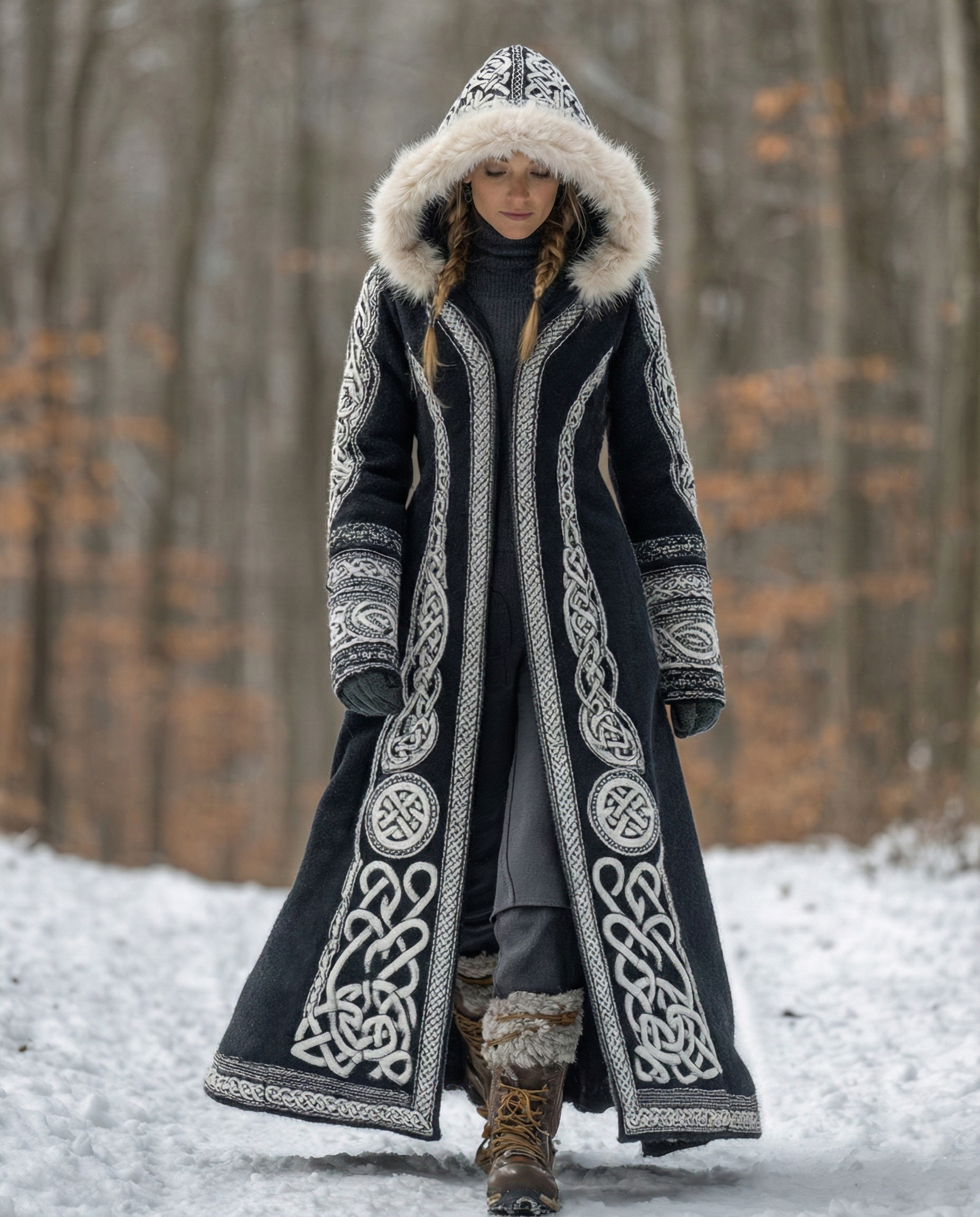 Women's Vintage Viking Celtic Knot Knitted Jacquard Fur Hooded Cardigan