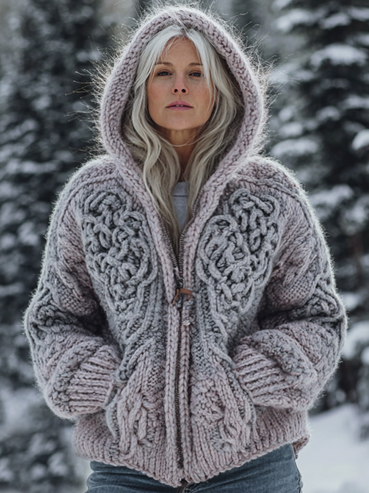 Women's Vintage Celtic Knot Art Knit Color Block Cozy Hooded Sweater