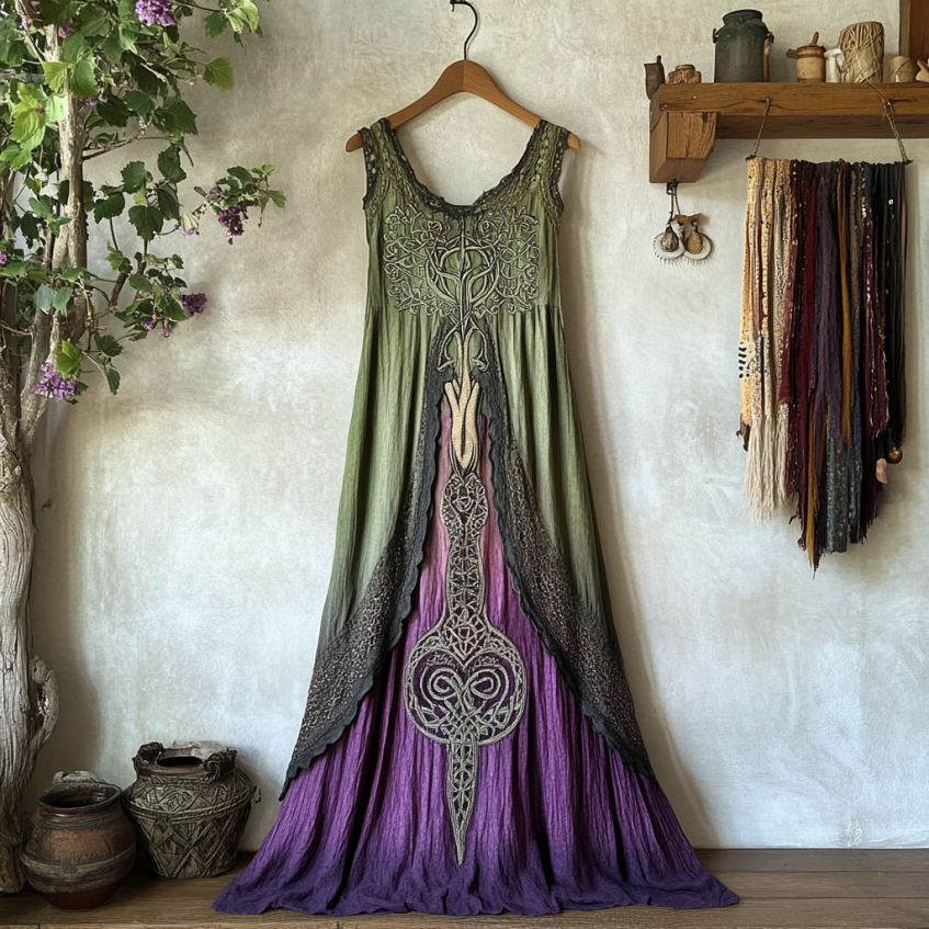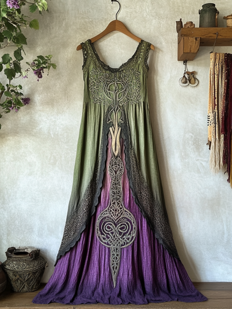 Vintage Viking Tribal Celtic Knot Life Of Tree Lace Patchwork Art Linen Tank Dress
