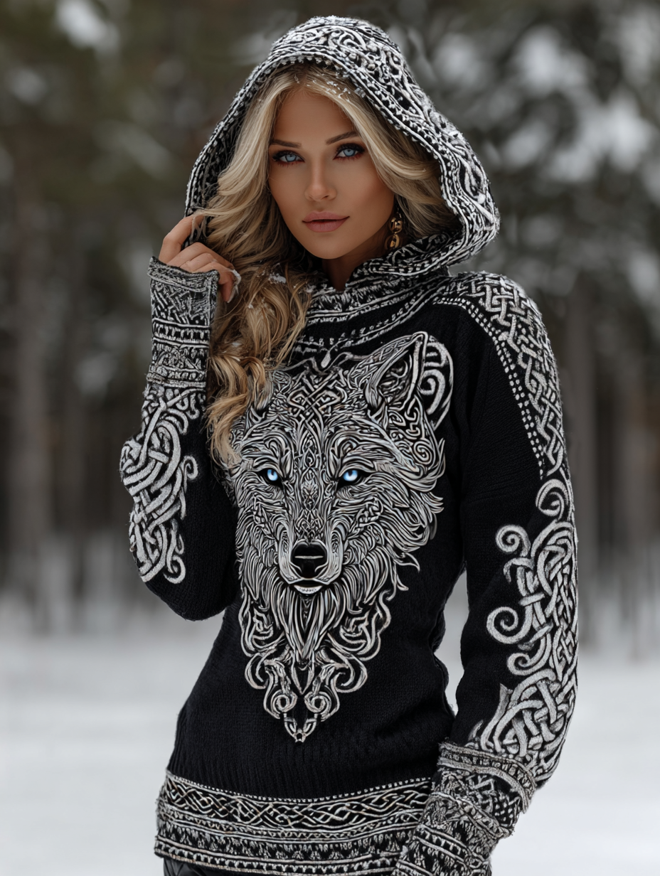 Women's Viking Celtic Knot With With Wolf Head Art Cozy Knit Hooded Sweater