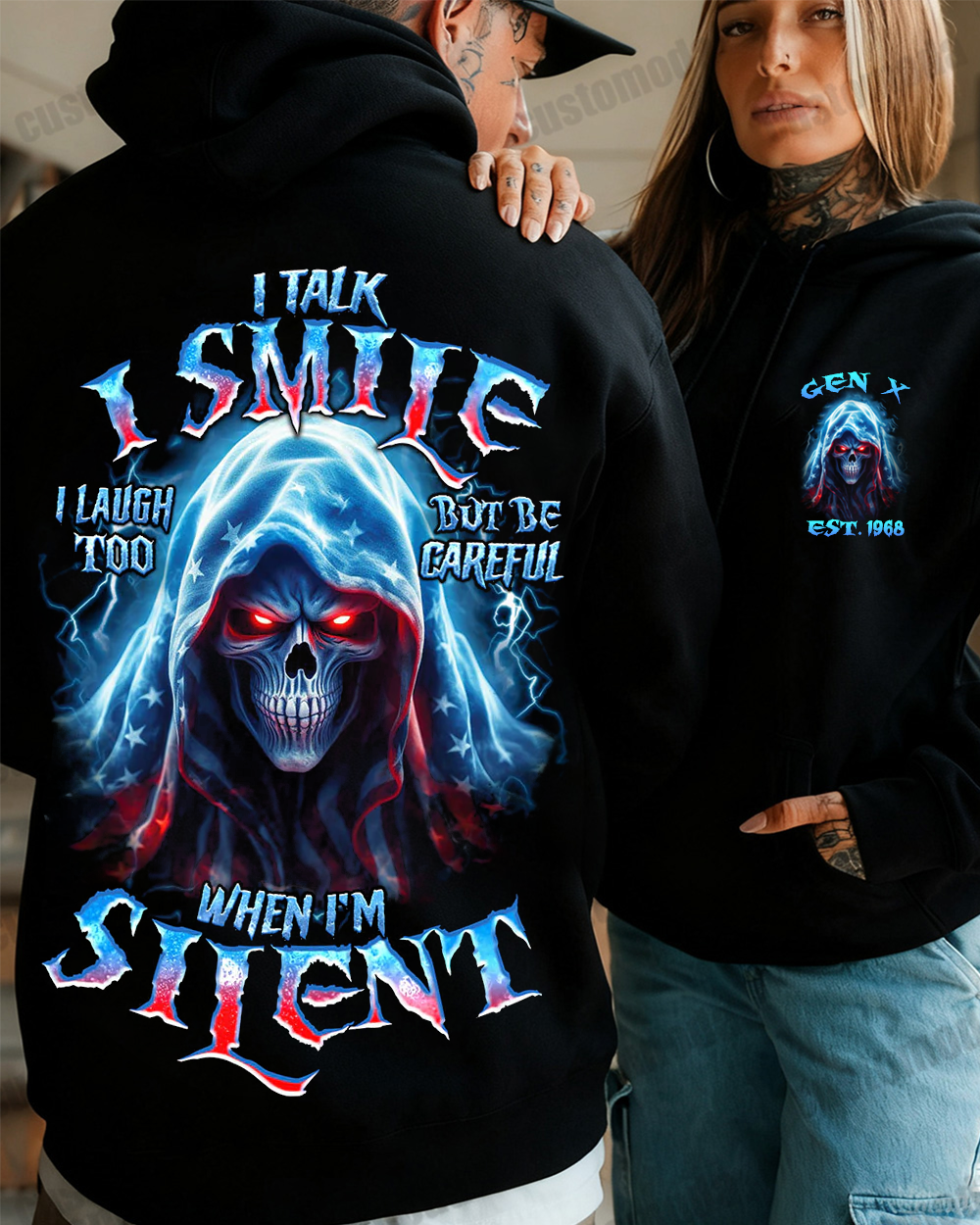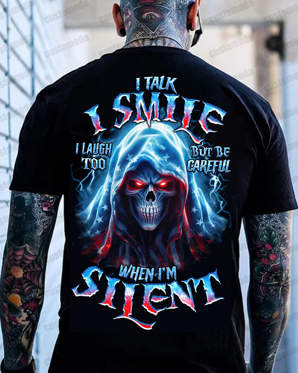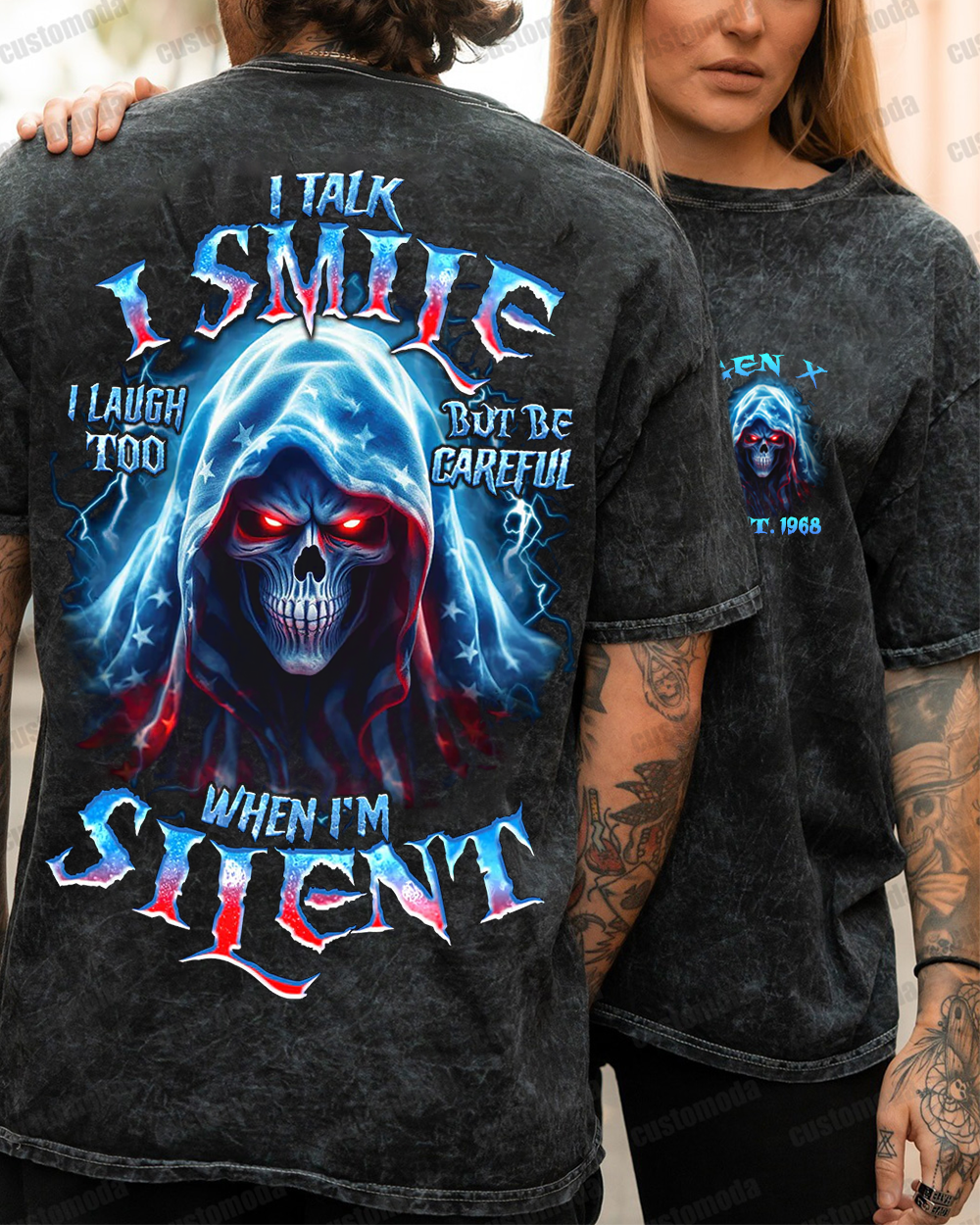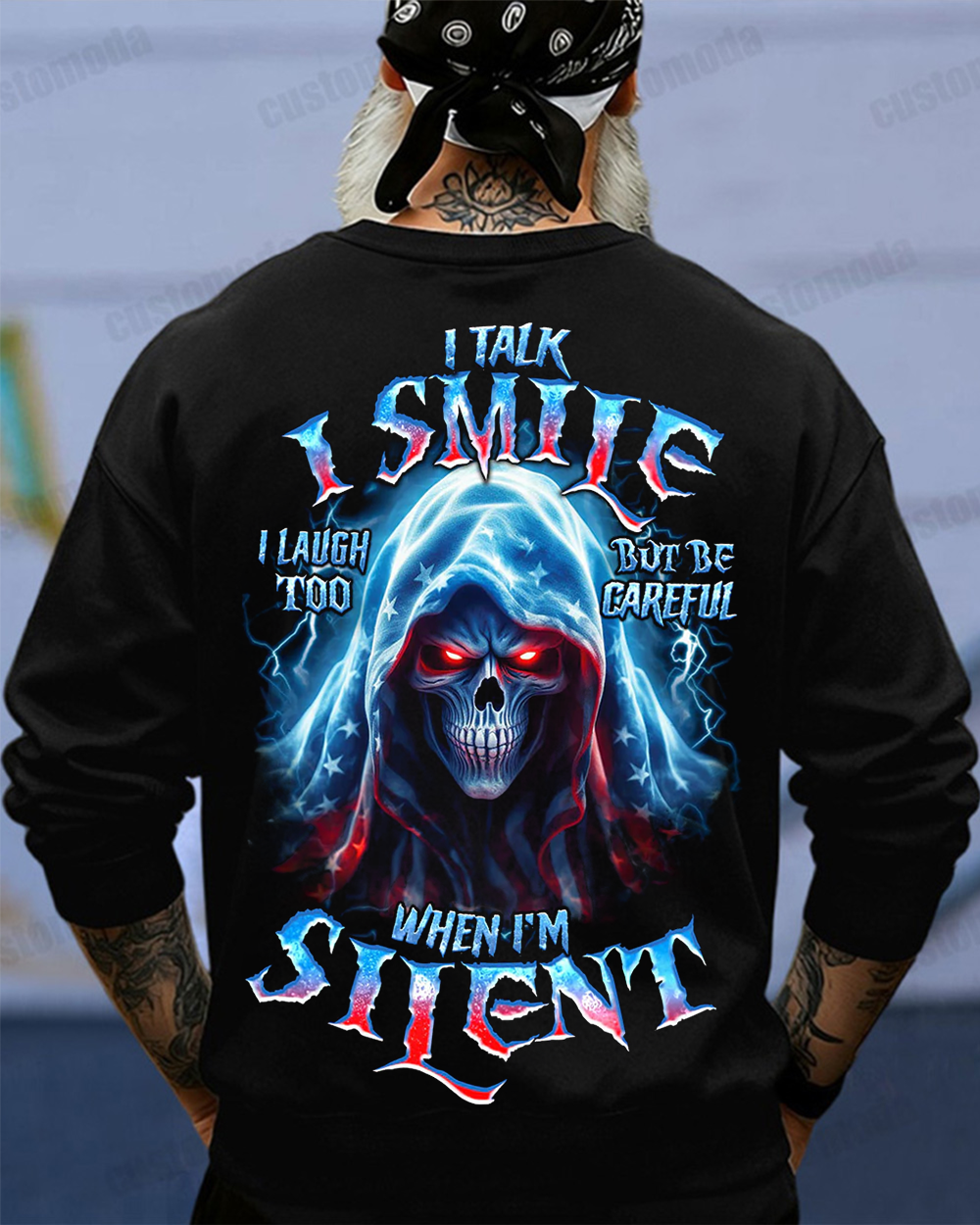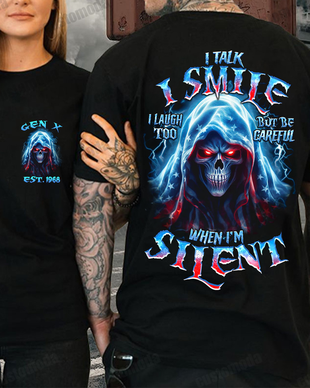This be careful when I'm silent reaper all over print is a powerful reminder of the intensity and mystery within silent moments. The fierce skull reaper, surrounded by stormy clouds and crackling thunder, 😈Symbolizes The Power And Potential That Lies Within Silence. A Must-Have For Those Who Understand The Power Of Words Unspoken.😈