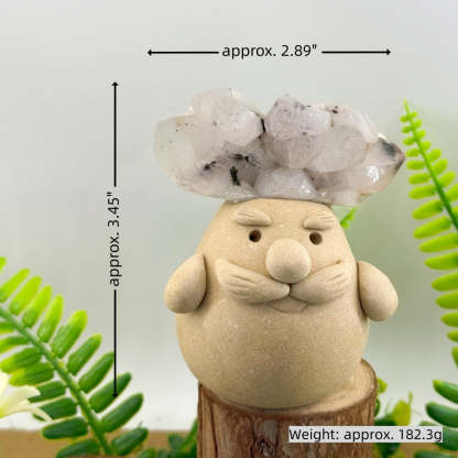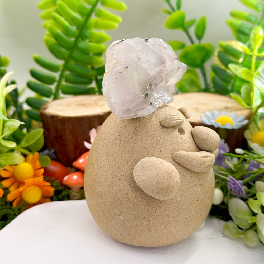 A cluster of natural garden quartz grows from the top of its head, symbolizing romance, gentleness, and emotional healing. It is believed to help cleanse negative energy, raise inner vibration, and ease feelings of melancholy, anxiety, and negative thought patterns—allowing the heart to slowly return to a sense of calm and hope.