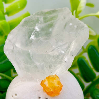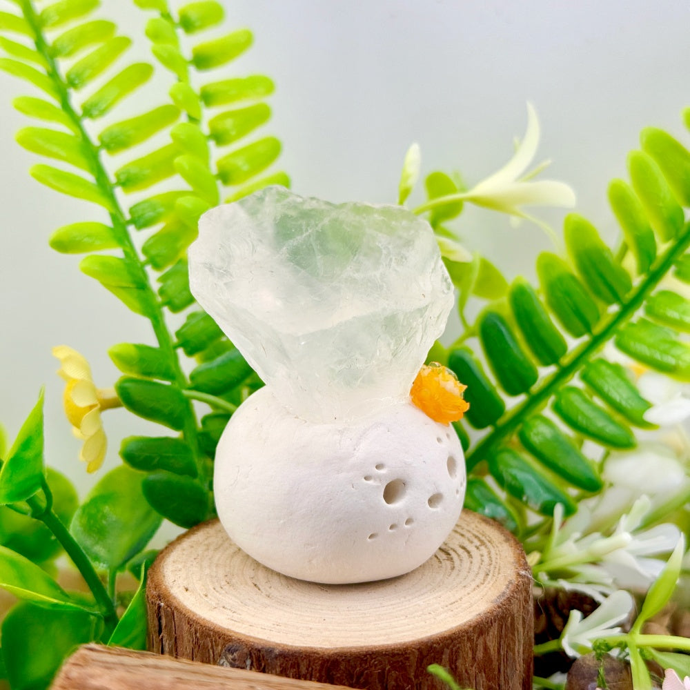 This Clear Quartz Crystal Pet is handcrafted from clay by the designer. Its small and simple bean-shaped body is paired with a cluster of natural clear quartz, like a bright and pure light shining atop its head.