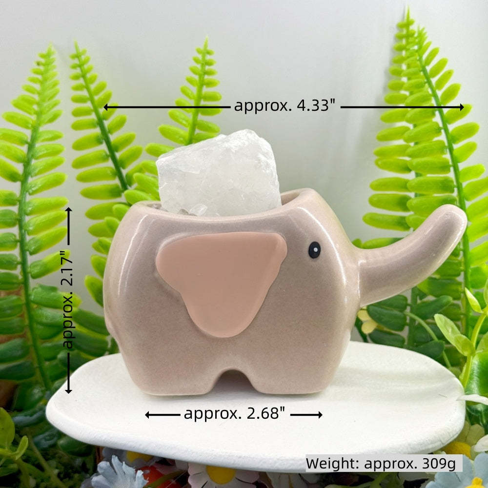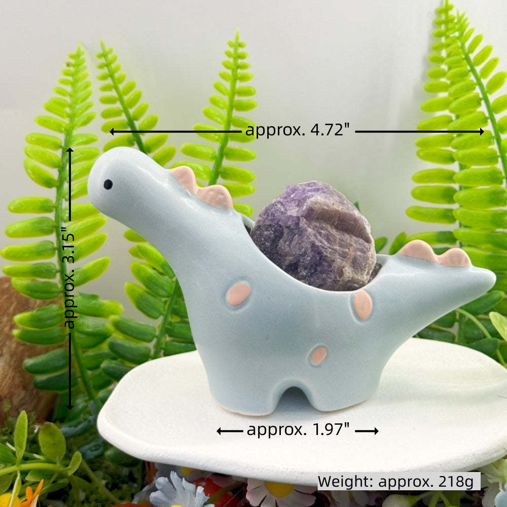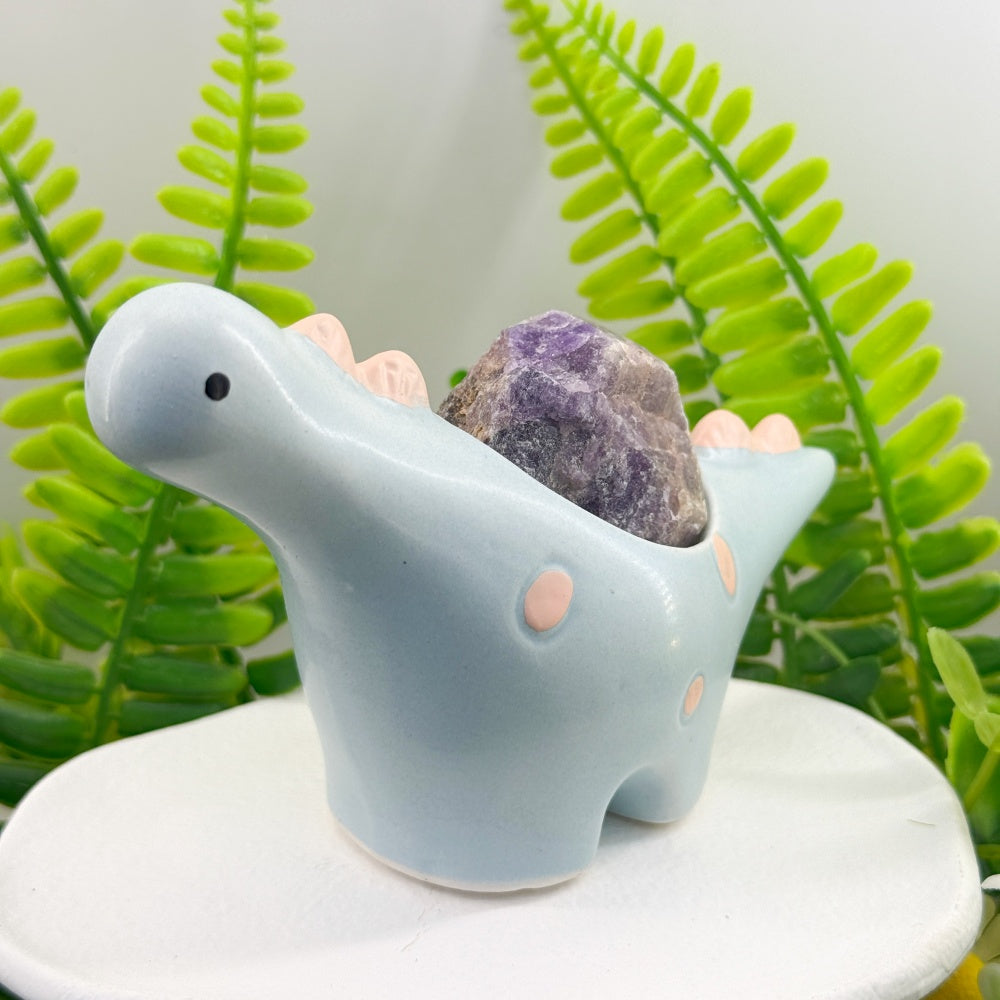 This adorable set of ceramic crystal animal figurines includes an elephant topped with clear quartz and a small dinosaur holding amethyst. Both designs are soft, cute, and bring a sense of ease and good mood to any living space.