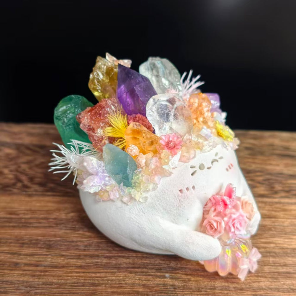 Its head is crowned with clusters of natural gemstones, like a blooming little energy garden — sparkling with dreamy and healing vibes.