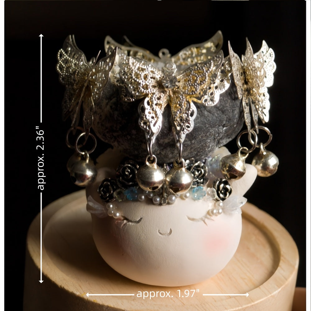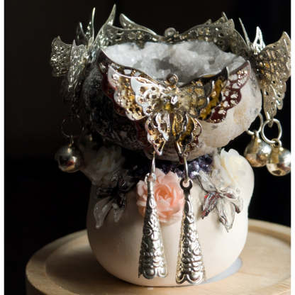 Handcrafted silver butterfly wings, soft jingling charms, roses and tiny pearls form a beautifully ornate crown — making it look like a noble guardian from the night, gentle and healing, yet radiating undeniable presence.