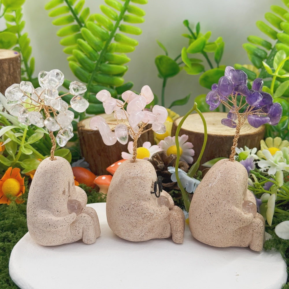 The amethyst sphere it holds gently in its arms acts like a little energy core, offering calm, protection, and emotional support.
