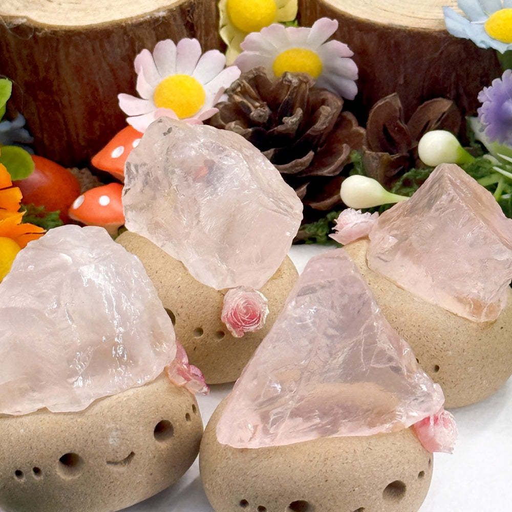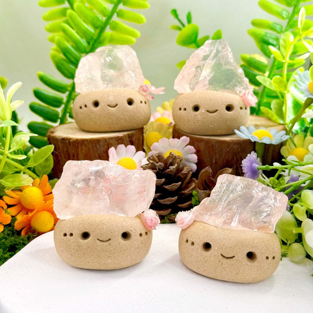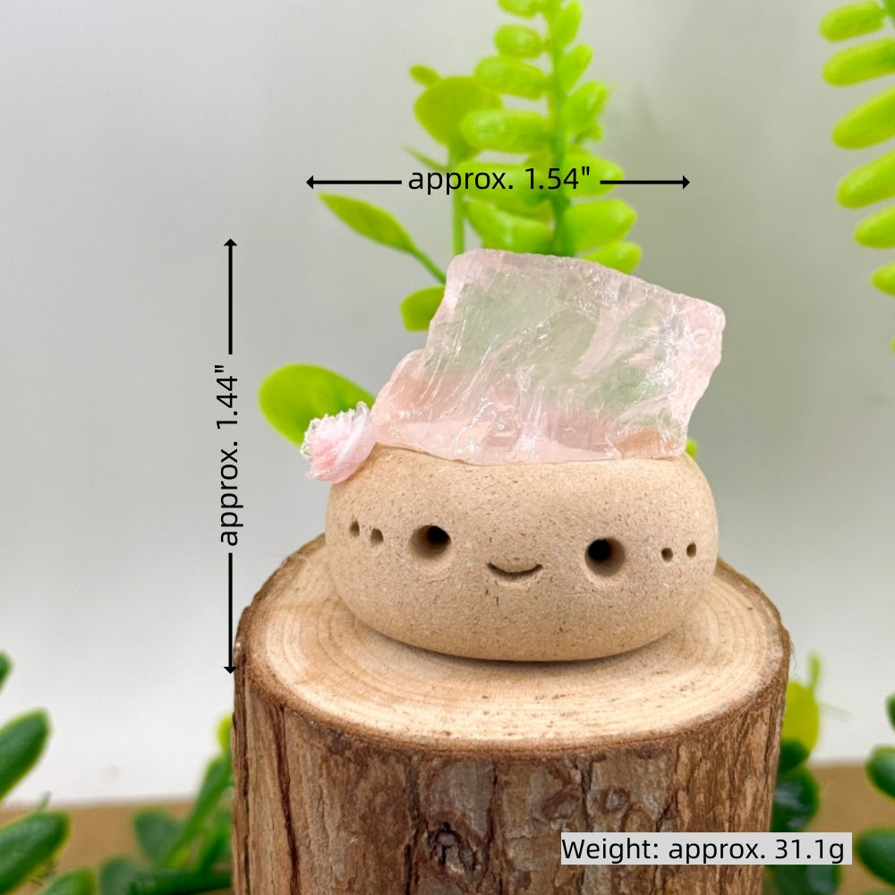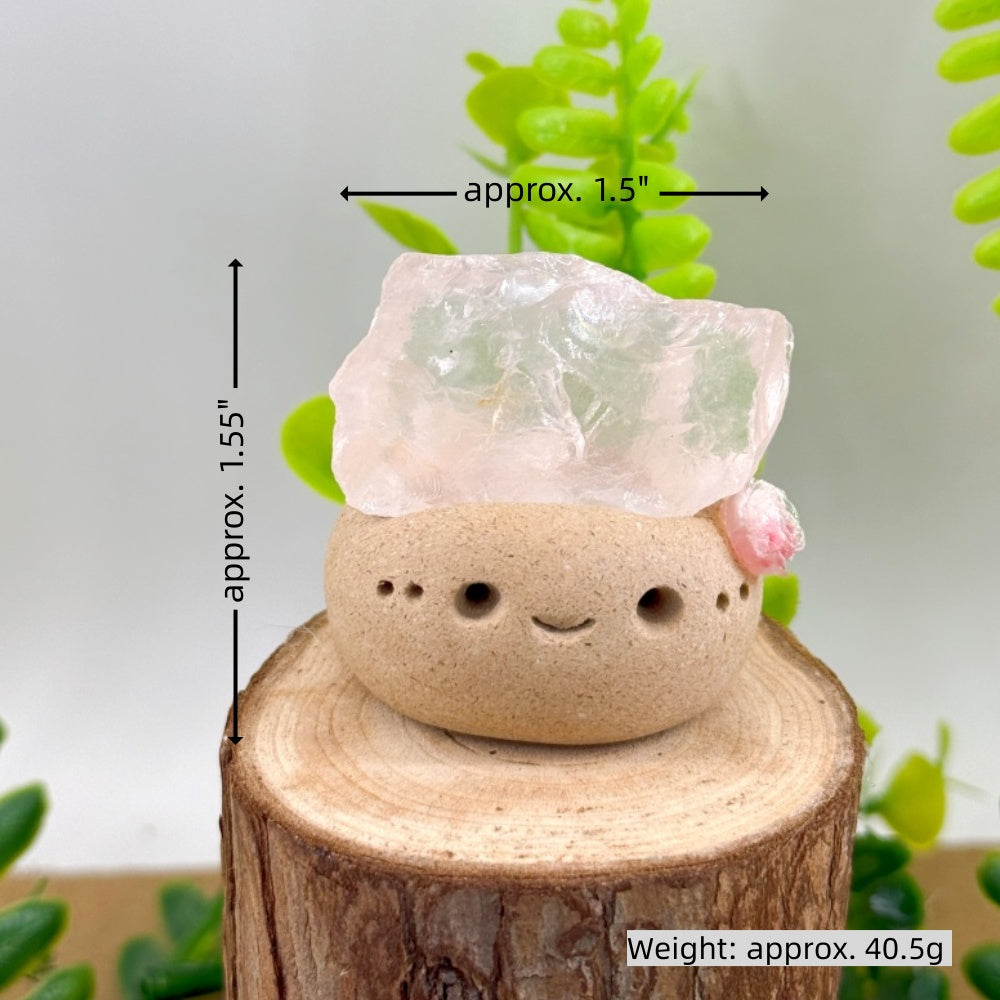 This Rose Quartz Crystal Pet is delicately handcrafted from clay by the designer, topped with a natural piece of rose quartz. The crystal shines with a soft pink glow, as gentle and graceful as the petals of a morning rose. With a sweet smile and a delicate floral accent, this charming figure radiates tenderness and romance, like a little guardian of love and happiness, bringing warmth and healing energy into daily life.