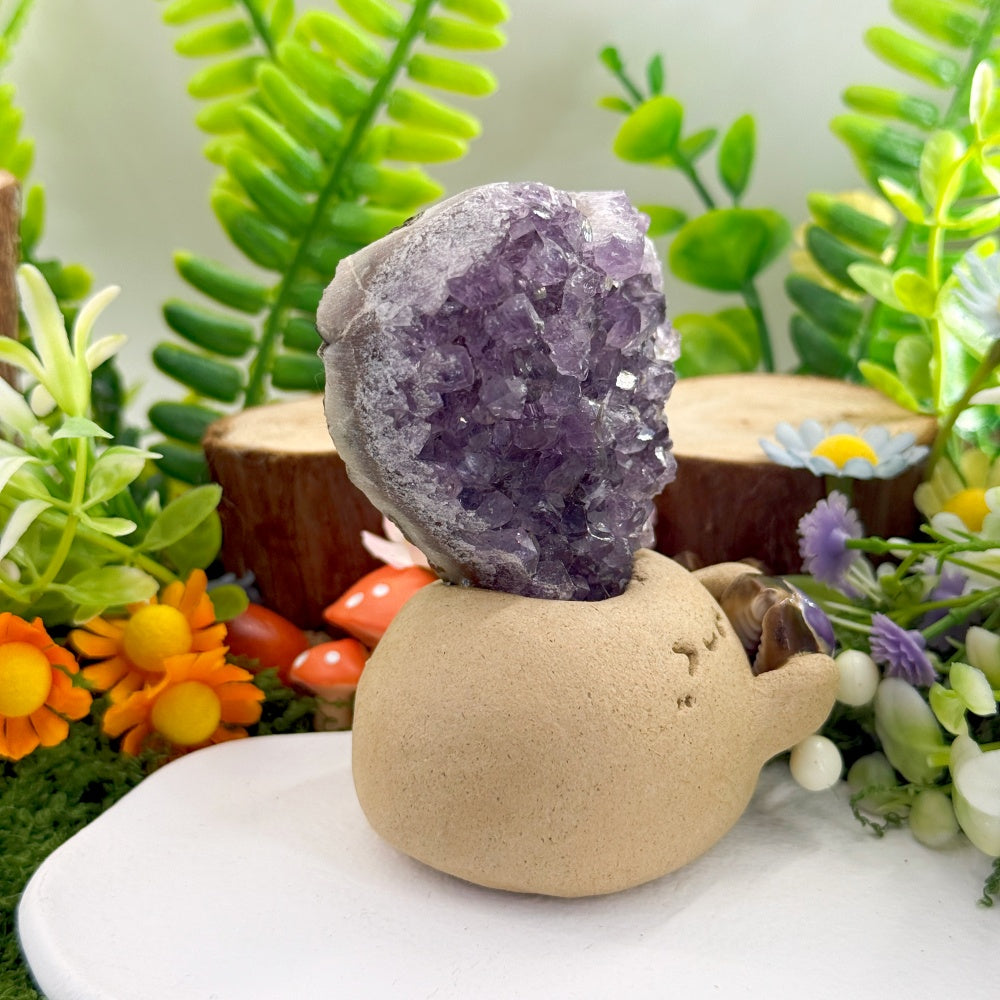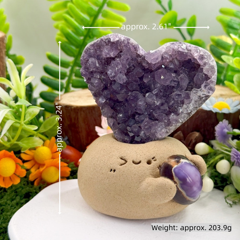 This Heart Amethyst Crystal Pet is lovingly handcrafted, featuring a rounded, adorable little figure gently holding a purple crystal, with a natural heart-shaped amethyst geode set atop its head—soft in spirit yet grounding in energy.