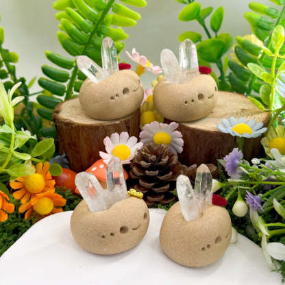 A piece of natural clear quartz is set on top, clear and luminous, as if infusing the little bunny with pure, steady energy.