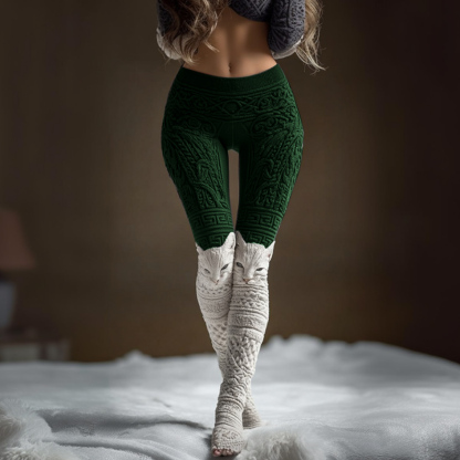 Retro Cat Black And White Patchwork Design Women's Knitted Tight-fitting Leggings