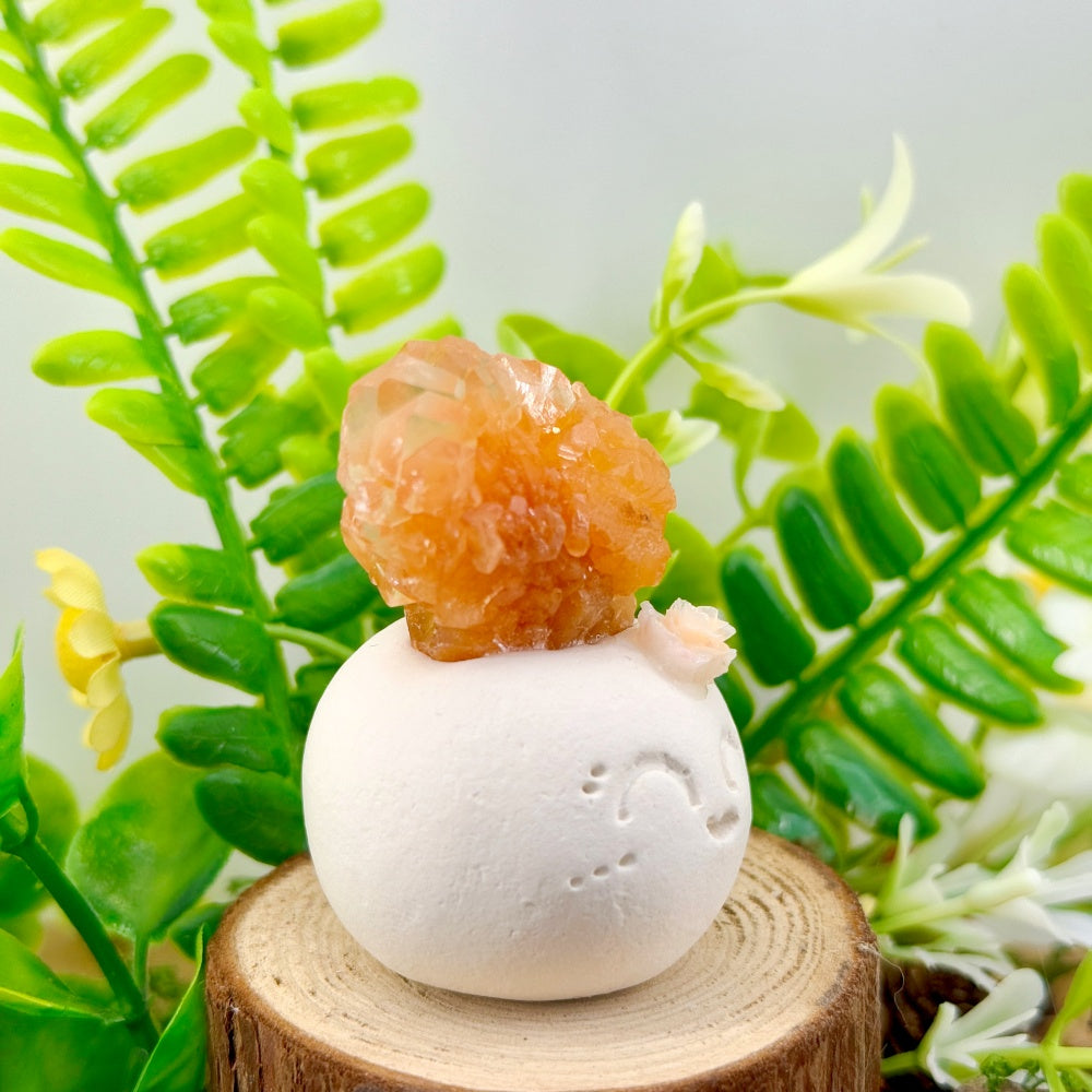 This Yellow Calcite Crystal Pet is handcrafted from clay by the designer. The gentle expression of the little bean is paired with a cluster of natural yellow calcite, like a warm sun-lit bloom shining atop its head.