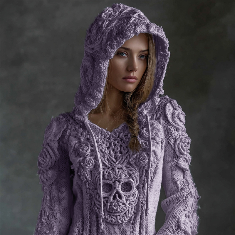 Vintage White Roses Viking Celtic Skull Hooded Cozy Knit Sweater