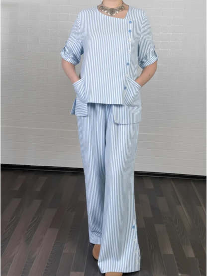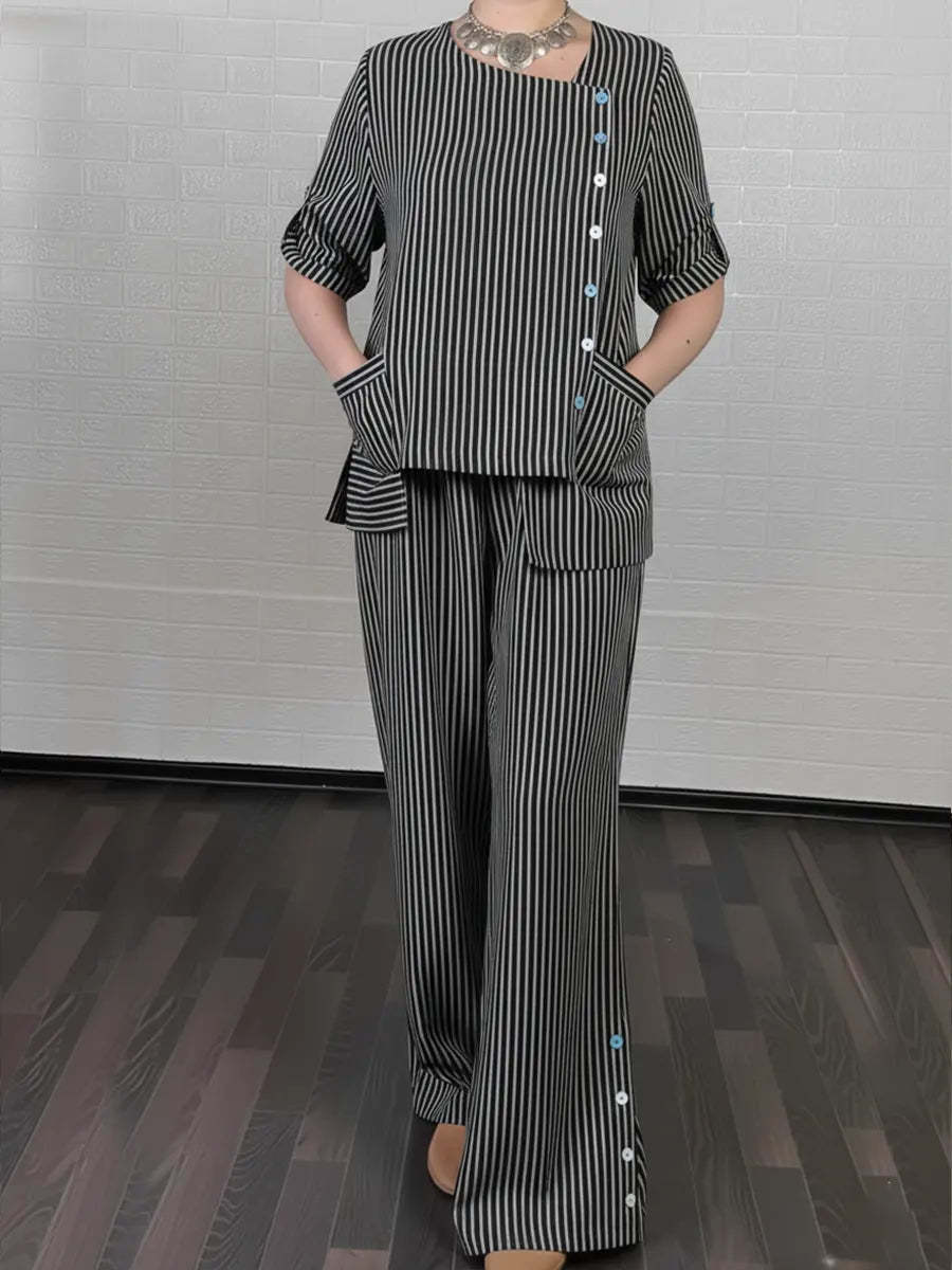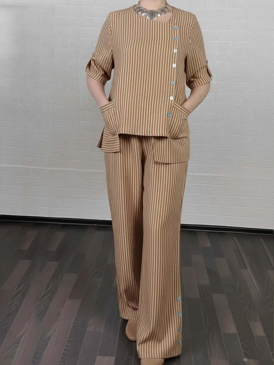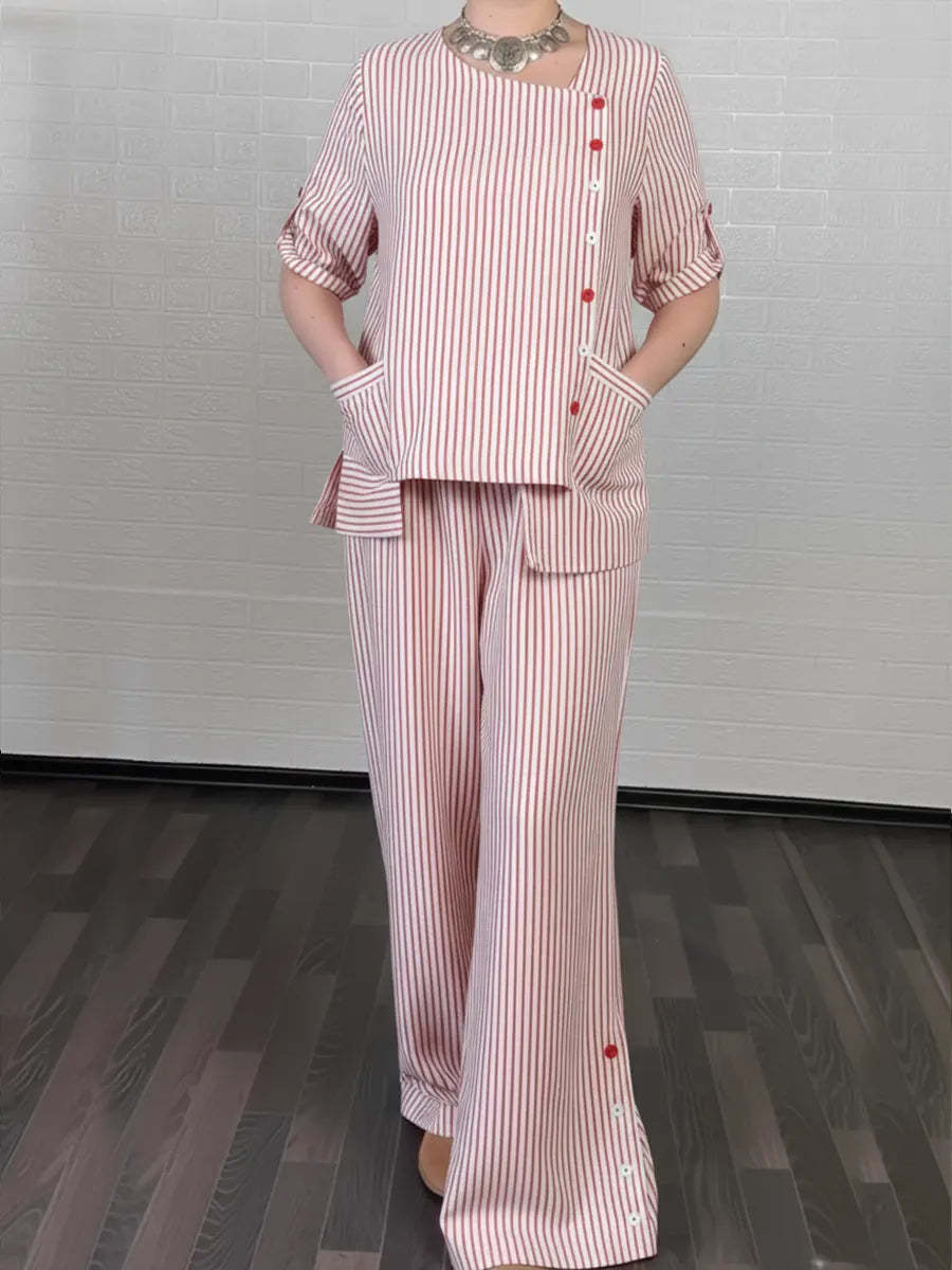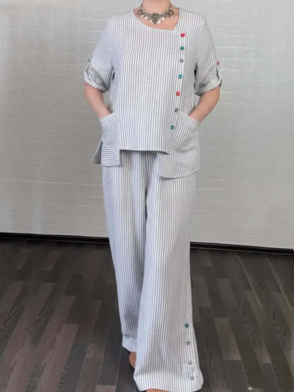 Women's Cozy Striped Linen And Cotton Top And Pants Two-piece Set.