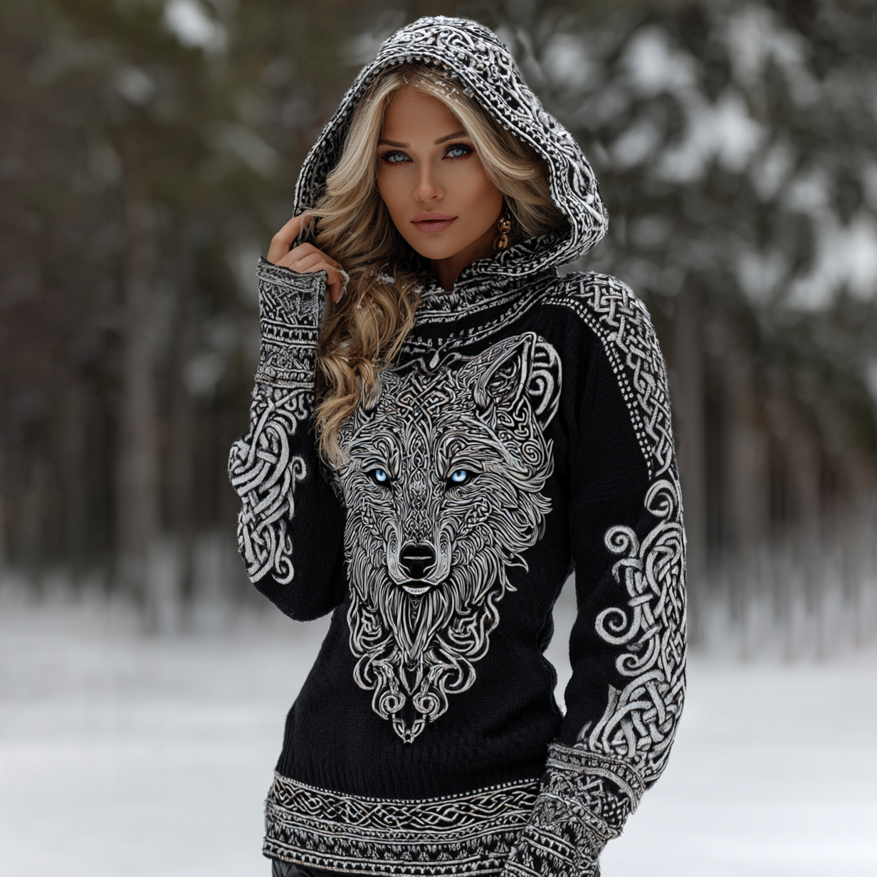 Women's Viking Celtic Knot With With Wolf Head Art Cozy Knit Hooded Sweater