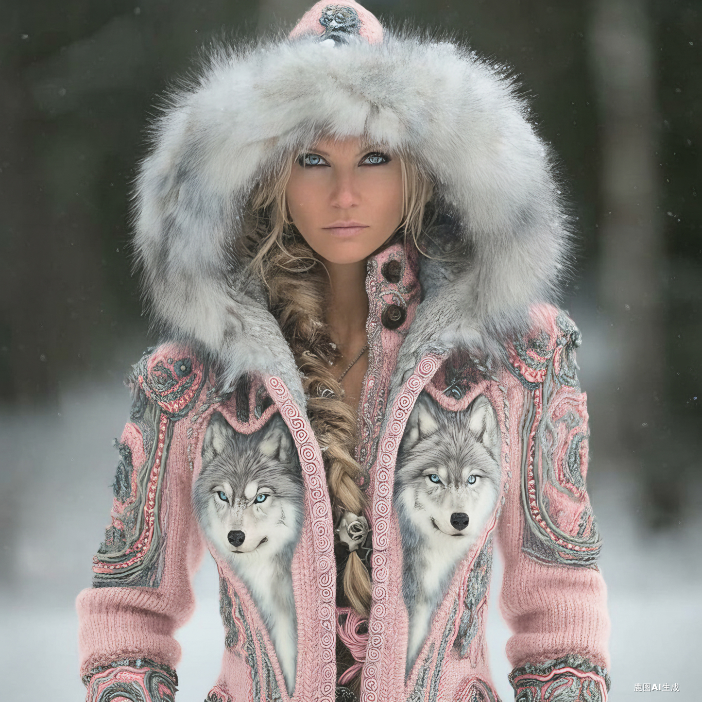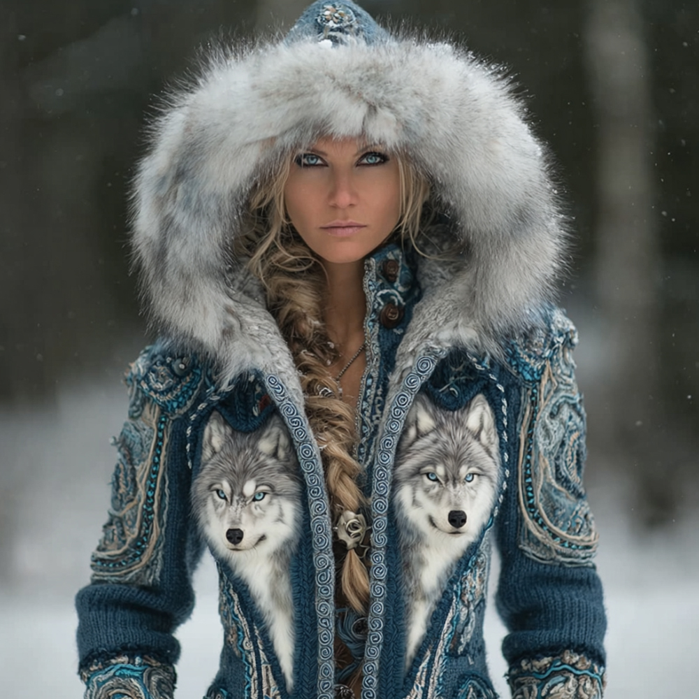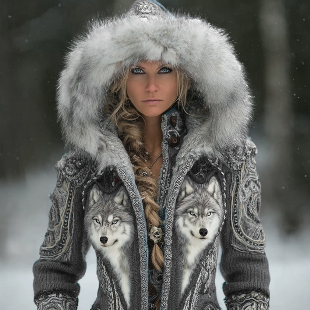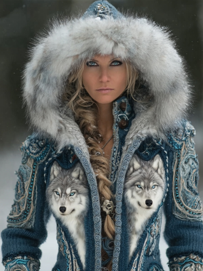 Women's Viking Style Three-dimensional Embroidered Wolf Retro Hooded Sweater